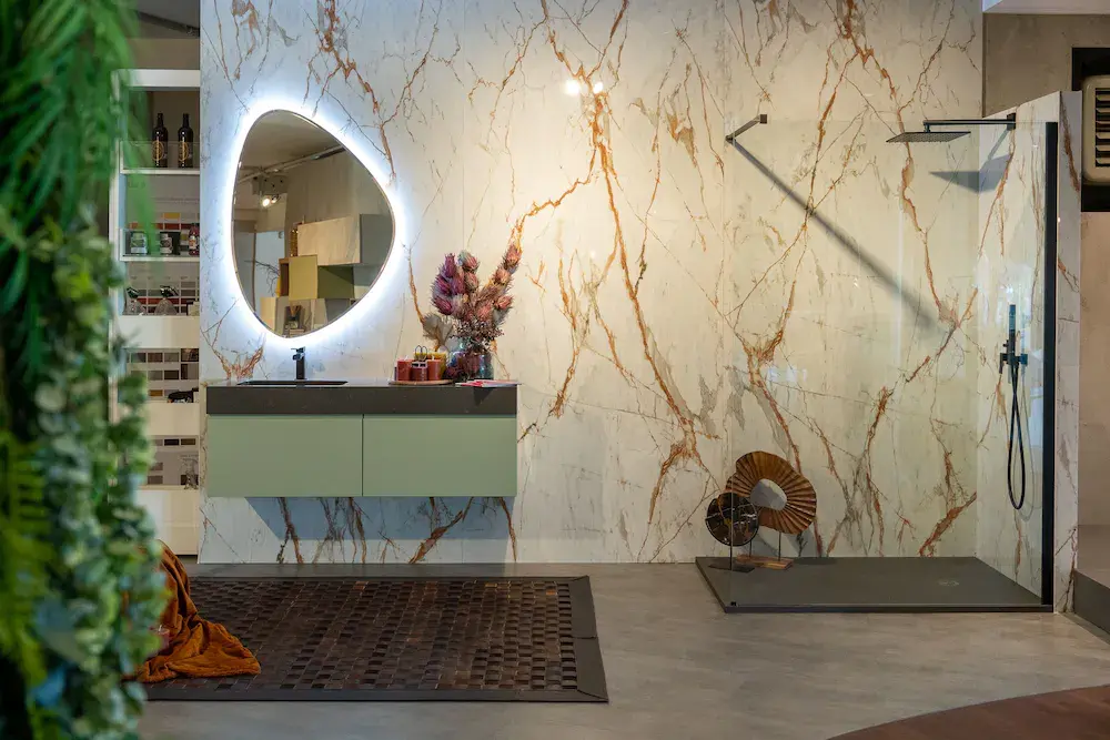 Değerli Paonazzo taşının ikonik özelliklerinin yeniden yorumlanması. Açık gri ve krem geçişli kalın damarlar ile paslı terakota ve ince mürekkep mavisi tonları