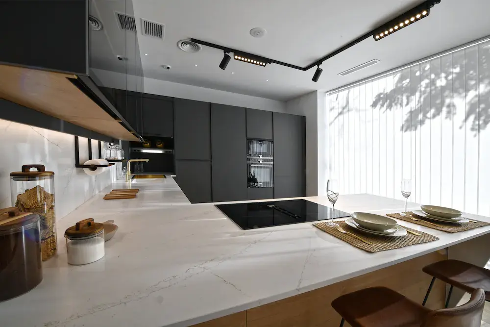 Altın ve grinin zarif tonlarındaki damarlar, nüanslı beyaz zeminle bütünleşiyor ve rengi her köşeye dağıtarak tasarıma değer katıyor.